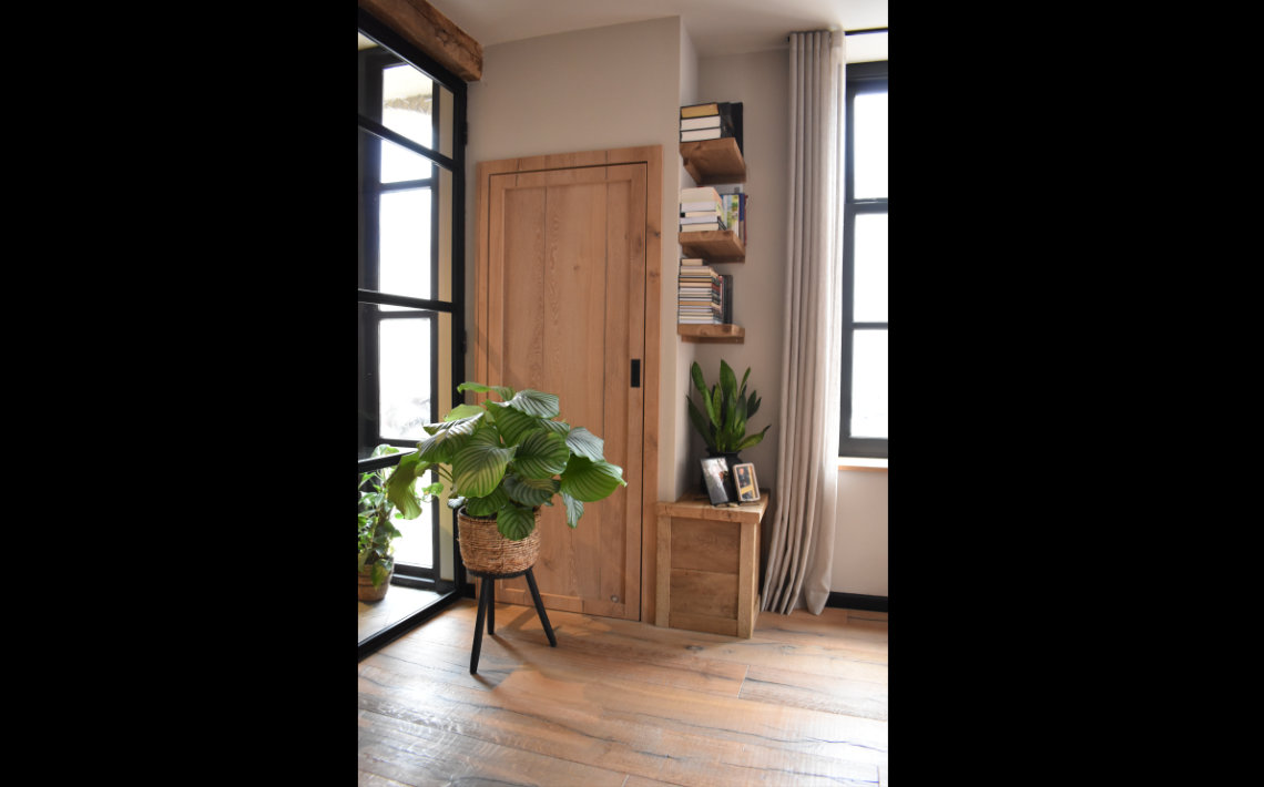De scheiding tussen de woonkamer en de gang is voorzien van stalen deuren met daaromheen eikenhout.